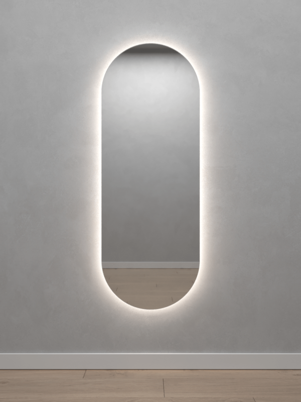 Безрамное зеркало овальной (капсульной) формы с контурной (тыльной) нейтральной подсветкой, свет 4000К. Подложка из высококачественного МДФ, светодиодная лента защищена матовым свето-рассеивателем от попадания пыли и влаги. Есть вывод 220W для подключения к сети, включение подсветки от выключателя на стене, либо от розетки.
